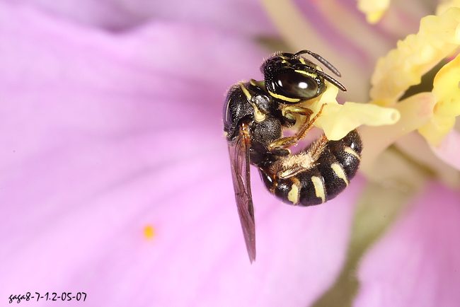 ↑11切葉蜂也想學學蜜蜂採蜜,可惜後腳沒有花粉籃構造,吸食花蜜又想帶花粉回家只好以這種捲曲的姿態賞花,這樣多少還會黏著一些花粉在身上。
