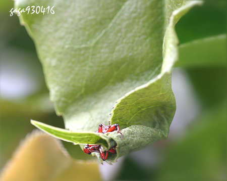 ↑時間很短,她從洞洞裡又鑽出來,在葉片折痕的前端,做出許