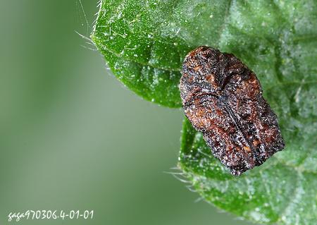 (金花蟲科)體長4mm,體背黑褐色具黑色雜斑及小突瘤,前胸背板下緣左右內凹,翅鞘 略呈矩形,翅端平齊,前翅後緣脈具突瘤排列成線狀。本種頭、胸、腹縮成一團,外觀擬態糞便,寄主植物為栗、櫻、櫟 、饅頭果等木本植物。本屬台灣已知22種,近似種具黑色、黑褐色或褐色等多種。
