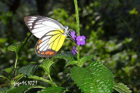 ↑紅紋粉蝶 (粉蝶科) 展翅 60 - 70 mm,雄蝶翅膀表面底色白色,上、下翅端具黑色 斑紋,雌蝶翅脈黑色較發達,下翅腹面具黃、白、黑、紅的斑 紋。 本屬有4種,本種又稱白豔粉蝶,分布於低、中海拔山區,以中、南部較多見,幼蟲寄住大葉桑寄生,北部較不普遍。