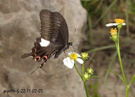 ↑白紋鳳蝶 (鳳蝶科)展翅 90 - 100 mm,雄蝶翅膀表面黑色,後翅具3枚緊鄰的白色塊狀斑紋,具尾突, 雌蝶翅膀顏色較雄蝶淡,後翅橙紅色斑較發達。本種外觀近似玉帶鳳蝶雌蟲翅腹面但本種後翅白斑為3枚,玉帶鳳蝶為4枚且本種體型較大。分布於低、中海拔山區但數量較少見,常見於溪谷及路邊草叢訪花吸水。