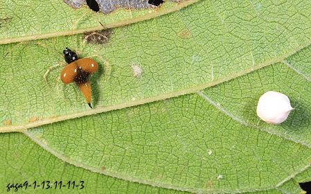 ↑黑色金姬蛛,雌,變異,腹部橙色,尾端黑色,棲息葛藤葉背,與正常個體混棲。(體長2.7mm)