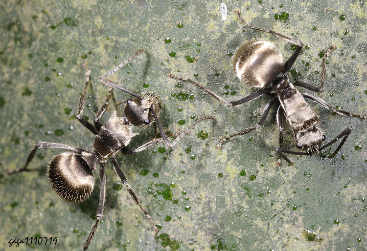 ↑拉多那棘山蟻 (蟻科 / 山蟻亞科 / 棘山蟻屬) 體長9mm,體背黑色具微弱的絲綢光澤,前胸背板前緣及中、後胸後緣各有一對棘刺,其中後胸的長棘刺上方還有一對向外的刺突,腹部有2條寬型的環帶。 本屬有12種之多,本種紀錄於低海拔500-700公尺山區,普遍。 其他:1141104、
