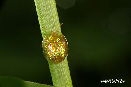 ↑甘藷龜金花蟲 (金花蟲科 / 龜金花蟲亞科) 體長 4 - 5 mm,體色綠色具強烈金屬光澤,翅鞘具2條縱向黑帶,靠近翅縫的黑色縱紋較短,兩側的縱帶至近翅端相連,部份個體黑帶斑消失。 本屬8種,本種又稱縱條姬斗笠金花蟲,體背周圍向外展樣子像斗笠,主要紀錄於平地至低海拔山區,幼蟲體色草綠色,體型略扁,各體節側緣突出具白色的肉刺,幼蟲和成蟲都以甘藷和牽牛花等旋花科植物寄主,啃食葉片, 在野外常見成蟲群聚在葉面上覓食、交尾,幾乎有此類植物就有牠們的族群,為常見的種類。