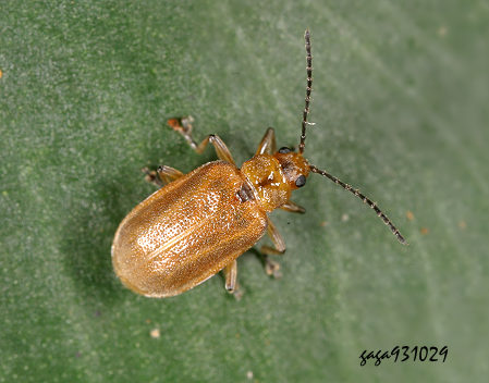 ↑蓼絨螢金花蟲 (金花蟲科 / 螢金花蟲亞科) 體長 4 - 6 mm,體背黃褐色密生絨毛,觸角黑色,前胸背板中央處有一個倒三角形的褐色斑紋,光滑不具絨毛,小楯板黑褐色,各腳黃褐色,節間具黑色的斑紋。 本屬2種,本種又稱毛背金花蟲 ,與近似種毛背金花蟲相較,本種觸角7-10節較寬長,主要分布於平地至低海拔山區,以蓼科的水蓼、花蓼、羊蹄、扛板歸、白苦柱等植物寄主,數量多見。
