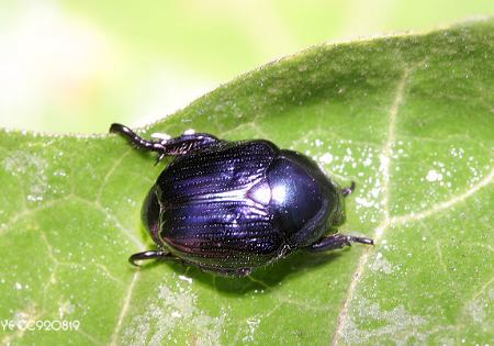 ↑台灣琉璃豆金龜(藍色型) (金龜子科) 體長12 - 14 mm,體色有藍色、綠色具強烈的金屬光澤,前胸背板寬大渾厚,翅鞘有溝紋及刻點呈縱向排列,近翅端刻點不明顯,近翅基部處後方有一對不明顯的凹陷橫紋,各腳與體色相同,腹末端無白色毛叢。 本屬10種,外觀近似藍豆金龜但其腹端有2個白色毛叢,本種普遍分布於低海拔山 區,常見於大花咸豐草、野牡丹的花朵上棲息,動作緩慢,受驚嚇會掉落地面飛離或鑽入土中。