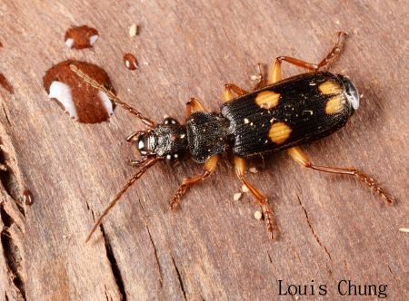 ↑三斑大唇步甲,可能相同的種類,合翅時翅面共有4枚橢圓形狀的黃斑,近翅端的黃斑接近翅縫。 (天祥)