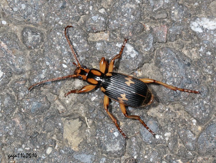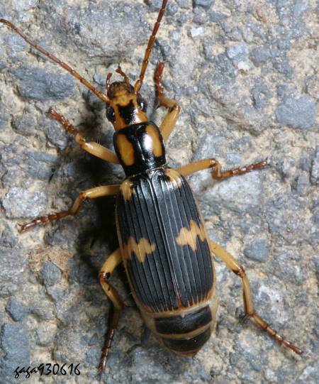 ↑↑爪哇屁步甲 Pheropsophus javanus,前胸背板有2條黃色縱斑,頭部的黑斑為長矩形。