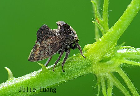↑背峰鋸角蟬 ,前翅黑褐色,近後緣2/3段於各脈間具大小不一的灰白色斑。 / 攝影: Julie Huang攝於新竹尖石鄉,發現寄主於懸鉤子植物。