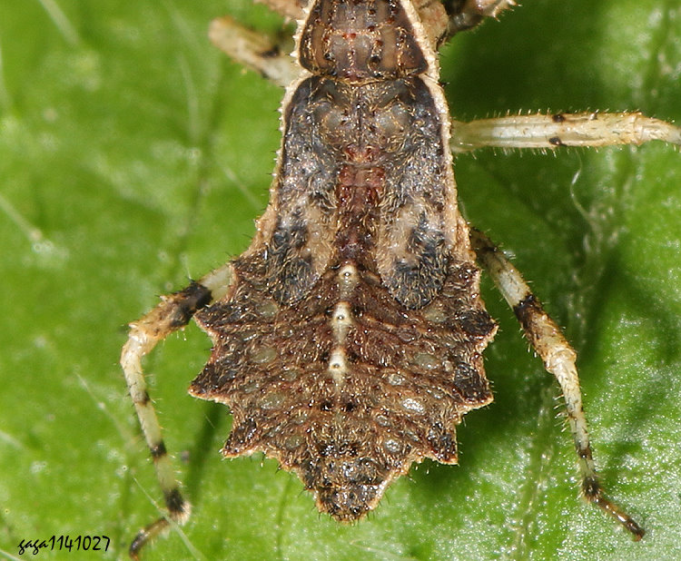 ↑塔獵椿象,體長12.5mm,體色黑褐色,前胸背板左右至後緣具稜邊,邊線黃褐色,外觀近似輪刺獵椿但本種腿節沒有瘤狀突起,前翅革質顏色較暗,腹背板外露具黑、黃白色橫斑。紀錄於低海拔山區,棲息低矮的草叢。