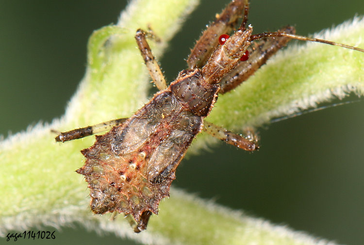 ↑塔獵椿象 (獵椿象科) 體長 12 - 14 mm,體深褐色,體表佈滿黃褐色絨毛,頭部側緣至前胸背板側緣有黃褐色邊線,後緣隆起具瘤狀突起,側角無銳刺,腹部向外擴張,側接緣的斑白色。 本屬2種,本種紀錄於低中海拔 500-1700公尺山區,成蟲2-5月,若蟲於10月大量發生於1500-1700公尺山區,但一般少見。