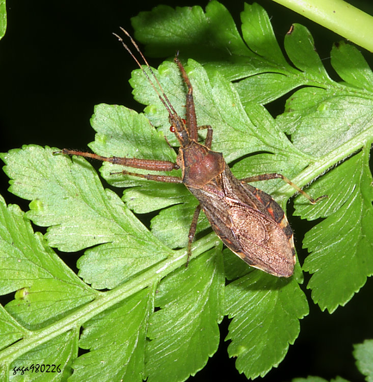 ↑塔獵椿象,體色暗紅褐色,胸背板前葉下側角不具短刺。