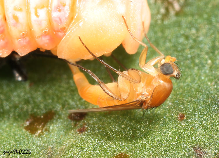 ![]() ↑ 異蚤蠅屬 Megaselia sp. (蚤蠅科 / 異蚤蠅屬 ) 物種描述: 小型,複眼黑色,觸角鞭節膨大,體色黃褐色,胸背板黃褐色,腹部側看駝背狀,腹部寬型的橫帶不明顯,翅膀透明,具簡單的縱脈,各腳腿節粗壯。