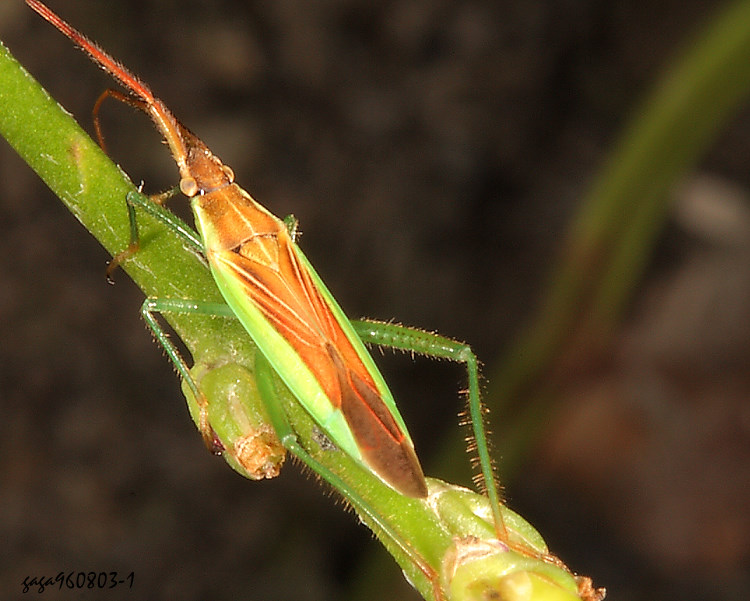 (盲椿科) 體長 9.2mm,體型細長,體色綠色,觸角4節前段著生細毛,頭部三角形,前胸背板至小盾片、革質翅皆褐色,側緣有寬型的綠色縱帶。
