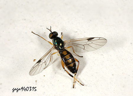 ↑星水虻屬 Actina sp. (展翅),同前,前胸背板藍綠色具光澤,腹背黑色,各節中央有褐色的大斑,翅膀透明,翅痣黑色。