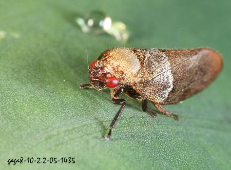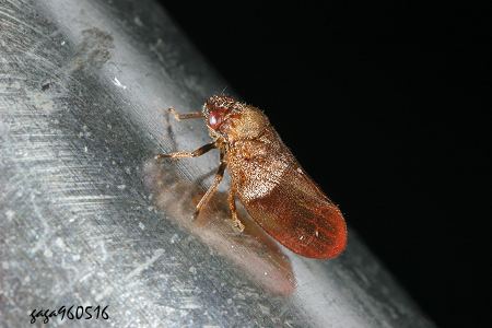↑曙沫蟬 (沫蟬科)體長約5-7mm,頭胸與前翅上半部灰褐色,後半部紅褐色,一般具白色的粉末但有些個體不明顯。前胸背板顏色較淺,下緣具弧線狀條紋,體表佈滿細小短毛。本種主要分布於低海拔