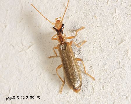 ↑小雙齒菊虎 (體長5.6mm) (關原) (菊虎科 / 小雙齒菊虎屬) 體長5.6-6.2mm,體色黃褐色,頭部寬大於前胸背板,複眼黑色外突,眼後方黑色,前胸背板正方型,中央有一枚對稱的褐色斑,內中空,翅鞘暗黃褐色,翅背近基部有一枚暗色的三角斑,各腳及觸角黃褐色。 本屬8種,本種分布於中高海拔山區,夜晚會趨光。