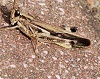 ↑條背土蝗,終齡若蟲已具翅芽,複眼下方有2條黃色縱線,中間黑綠色。