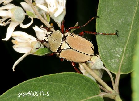 ↑台灣角金龜 (雄) (金龜子科 /角金龜屬 ) 體長約20-35 mm,雄蟲頭部前方有紅褐色的鹿角狀犄角,俗稱台灣鹿角金龜,體背灰褐色或黃褐色,老熟的個體粉末會掉落呈黑褐色,雌蟲體型較大,頭部前方無犄角。但雌雄前胸背板一般都有一枚八字紋,翅鞘前緣上下端各有一枚不明顯的黑色斑紋。 雄蟲大顎分岔狀發達,各腳細長,尤其跗節的長度超過脛節,停棲時常將前足往兩邊攤平,遇到騷擾也會有這種動作,一種警戒或偽裝,習性十分奇特。 本屬6種,本種分布於低 、中海拔山區,成蟲出現於4 - 7 月,常於木本科植物樹冠的花朵上吸食花蜜,數量為同屬中最常見的。