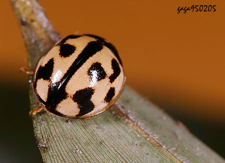 ↑變斑盤瓢蟲 (瓢蟲科) 體長 4 - 5mm,體色橙褐色,前胸背板有2枚黑斑,翅鞘左右各有4枚黑斑,近翅端中央接合處有1枚黑斑,共計9枚。 本屬有14種,本種又稱九星瓢蟲,紀錄於平地至低海拔山區,有多種變異,翅面斑紋差異甚大但前胸背板的白斑通常穩定,有些個體的斑型非常稀少。