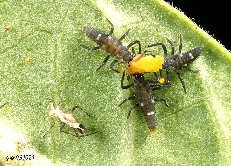 ↑變斑盤瓢蟲 ,幼蟲,取食蚜蟲。