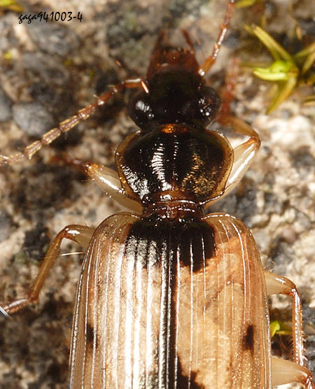 (步行蟲科 /壺步甲亞科/壺步甲屬) ) 體長9mm,頭、胸黑色,前胸背板側緣淡黃褐色,翅鞘黃褐色具縱向溝紋,翅基及翅下方後緣有黑色斑,各腳淺褐色,脛節顏色較深。
