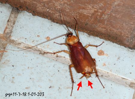 ↑棕色家蠊,翅膀受傷,腹端有2對一長一短的尾毛。 (板橋)