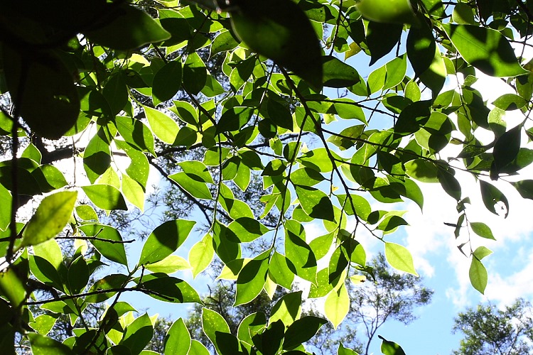 延著山徑走,樹林間露出的海面波光粼粼,