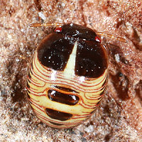 (一) 昆蟲的分類:動物界→節肢動物門→昆蟲綱→半翅目→異翅亞目→扁椿總科→扁椿科 (二)瓢蟲科:俗稱瓢蟲,生活史為卵→若蟲→成蟲,屬於不完全變態昆蟲。 體型皆小,扁平,褐色或黑色,頭平伸,複眼小,無單眼,觸角4節,體背皺摺或巨瘤突,成蟲無翅或短翅,各足跗節數均為 2 節,一般棲息樹皮或枯木,以真菌類為食。台灣已知扁椿象有23種。 |