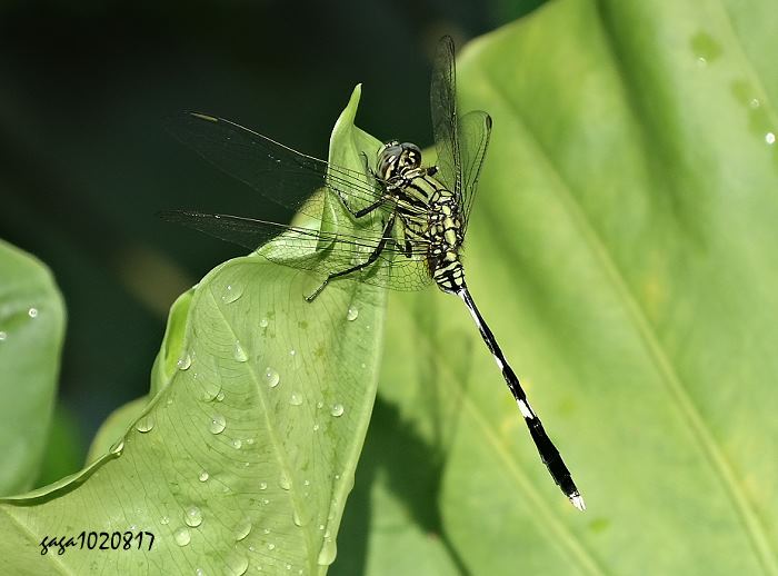↑杜松蜻蜓 (蜻蜓科)體長48-53mm,雄蟲複眼綠色,胸部綠色,側視有6條散亂的黑色斑紋,腹部黑色,第1-3節膨大,3節後變細,7-10節黑色較粗,腹側具3-4枚白色的大斑,攫握器白色,翅膀透明,翅痣黃褐色。雌蟲外觀近似雄蟲,可從尾毛的構造分別。 本種分布於低中海拔山區,常見於水田、池塘、沼澤等水域活動,環境適應能力佳,為優勢的種類,數量很多。 近似種白刃蜻蜓,雄蟲體色具白粉,雌蟲極似杜松蜻蜓但腹部較粗,腹背面具2條縱向的黃褐色斑,翅膀雌雄都是黑色,杜松蜻蜓為黃褐色。