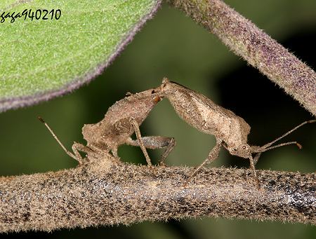 ↑瘤緣椿象 ,於茄葉下交尾,體色與環境近似。