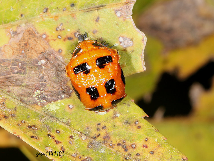 ↑小十三星瓢蟲,蛹橙黃色,左右各節間具黑斑呈縱向排列。