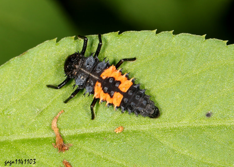 ↑小十三星瓢蟲,幼蟲體背黑色,中央有一枚橙黃色大斑,斑內黑色。