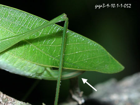 ↑ 姬擬綠螽 ,雌,翅脈清晰可見,產卵器粗大而長。