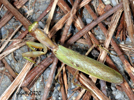 ↑寬腹斧螳,雄、黃綠色個體,前胸較枯葉大刀螳螂寬。