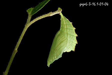 ↑豹紋蝶,終齡幼蟲,體側有一條黑褐色的縱紋,頭部有一對長犄角。 ↑豹紋蝶,蛹垂掛樹枝上,型態酷似葉片。